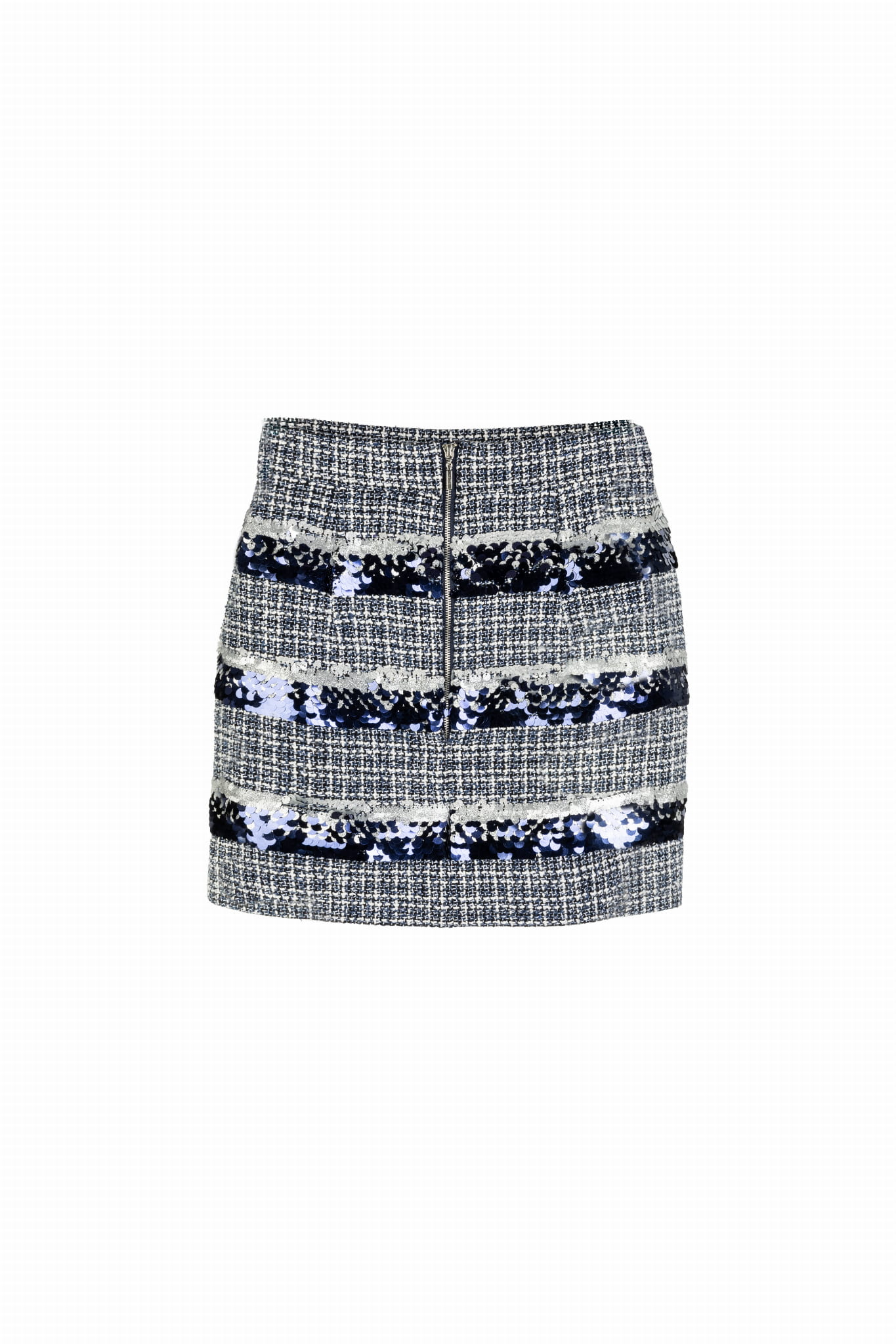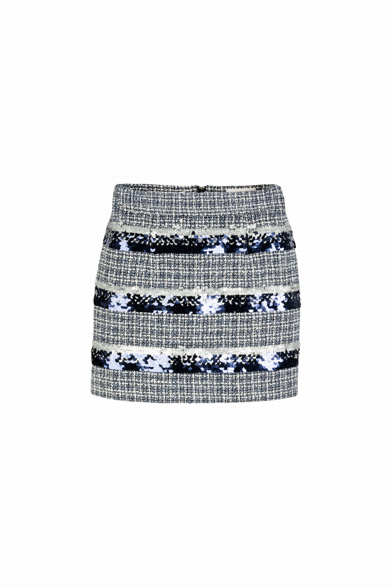 Nasza spódnica Monaco to wyjątkowy element garderoby, który łączy w sobie klasykę z nowoczesnością. Wykonana z luksusowej tkaniny Chanel, wzbogacona została o paski cekinów w kolorach niebieskim i białym, co nadaje jej niepowtarzalny blask i elegancję.